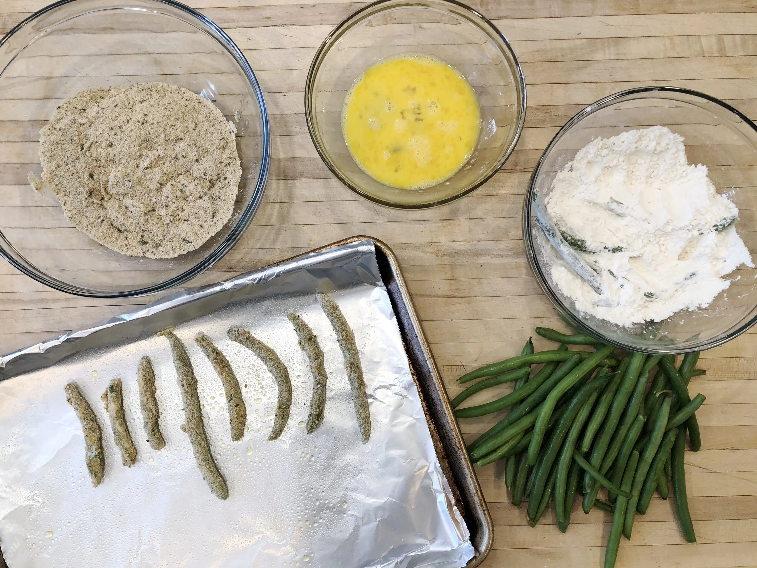 4. Coat green bean in flour, then the egg wash, then the bread crumbs. Repeat until all of the Green Beans are coated.